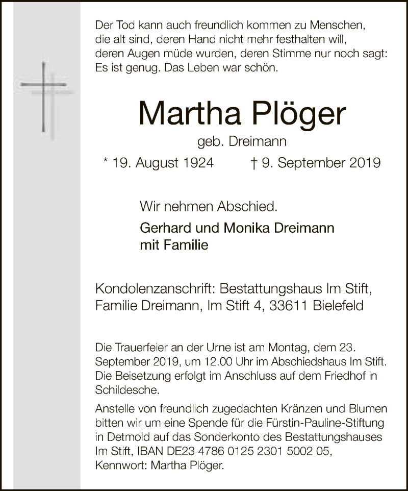 Hier finden Sie alle Traueranzeigen aus der Zeitung, die bisher für Martha Plöger erschienen sind. Weitere Traueranzeigen, die in der Zeitung erscheinen, werden hier ebenfalls aufgelistet