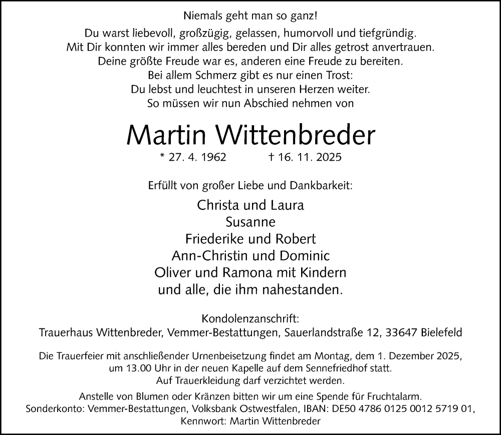 Hier finden Sie alle Traueranzeigen aus der Zeitung, die bisher für Martin Wittenbreder erschienen sind. Weitere Traueranzeigen, die in der Zeitung erscheinen, werden hier ebenfalls aufgelistet