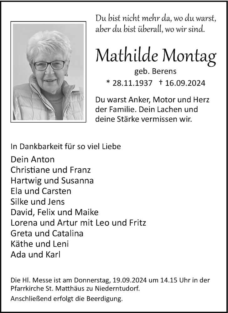 Hier finden Sie alle Traueranzeigen aus der Zeitung, die bisher für Mathilde Montag erschienen sind. Weitere Traueranzeigen, die in der Zeitung erscheinen, werden hier ebenfalls aufgelistet