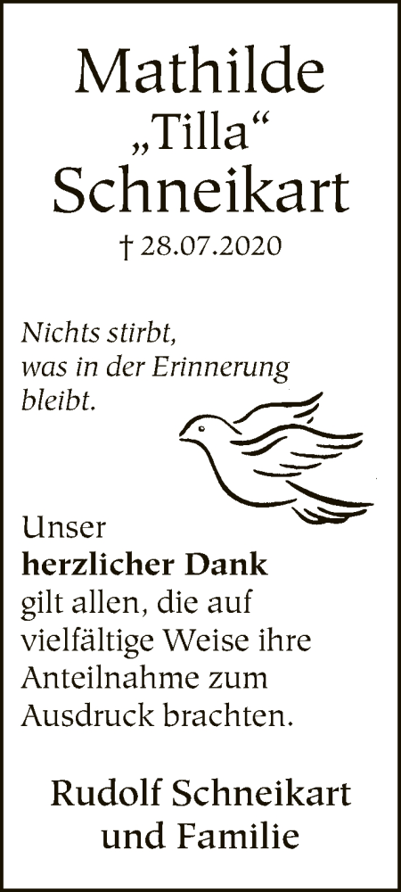 Hier finden Sie alle Traueranzeigen aus der Zeitung, die bisher für Mathilde Schneikart erschienen sind. Weitere Traueranzeigen, die in der Zeitung erscheinen, werden hier ebenfalls aufgelistet