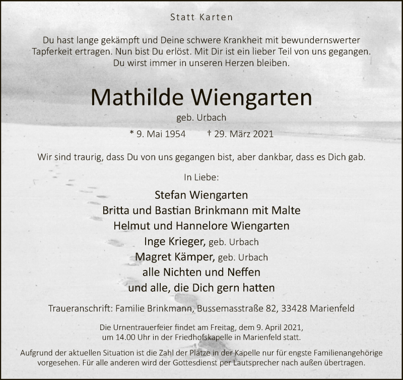 Hier finden Sie alle Traueranzeigen aus der Zeitung, die bisher für Mathilde Wiengarten erschienen sind. Weitere Traueranzeigen, die in der Zeitung erscheinen, werden hier ebenfalls aufgelistet