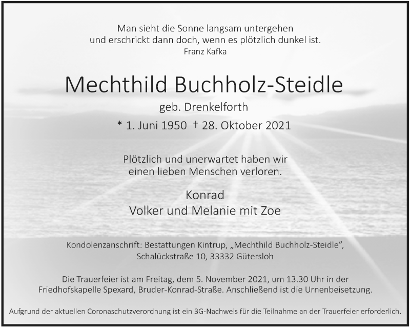 Hier finden Sie alle Traueranzeigen aus der Zeitung, die bisher für Mechthild Buchholz-Steidle erschienen sind. Weitere Traueranzeigen, die in der Zeitung erscheinen, werden hier ebenfalls aufgelistet