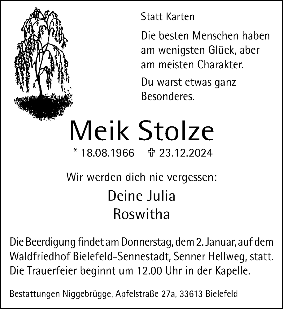 Hier finden Sie alle Traueranzeigen aus der Zeitung, die bisher für Meik Stolze erschienen sind. Weitere Traueranzeigen, die in der Zeitung erscheinen, werden hier ebenfalls aufgelistet