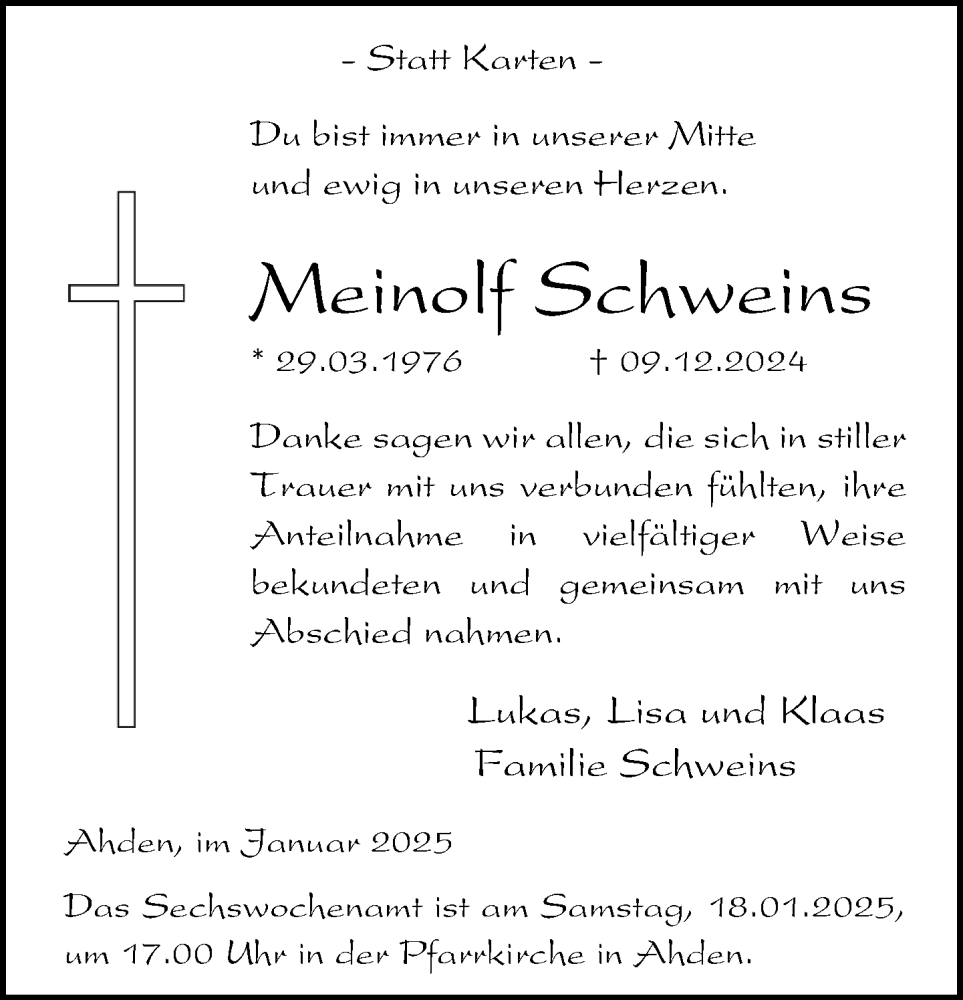 Hier finden Sie alle Traueranzeigen aus der Zeitung, die bisher für Meinolf Schweins erschienen sind. Weitere Traueranzeigen, die in der Zeitung erscheinen, werden hier ebenfalls aufgelistet