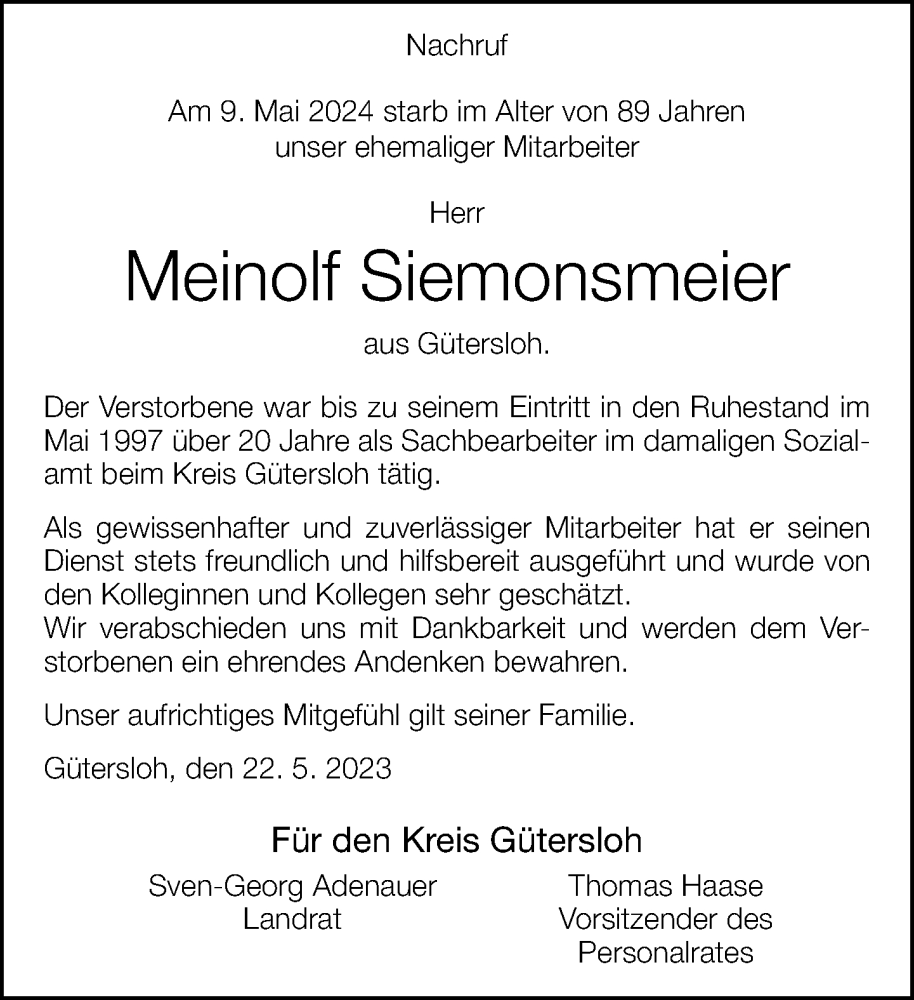 Hier finden Sie alle Traueranzeigen aus der Zeitung, die bisher für Meinolf Siemonsmeier erschienen sind. Weitere Traueranzeigen, die in der Zeitung erscheinen, werden hier ebenfalls aufgelistet