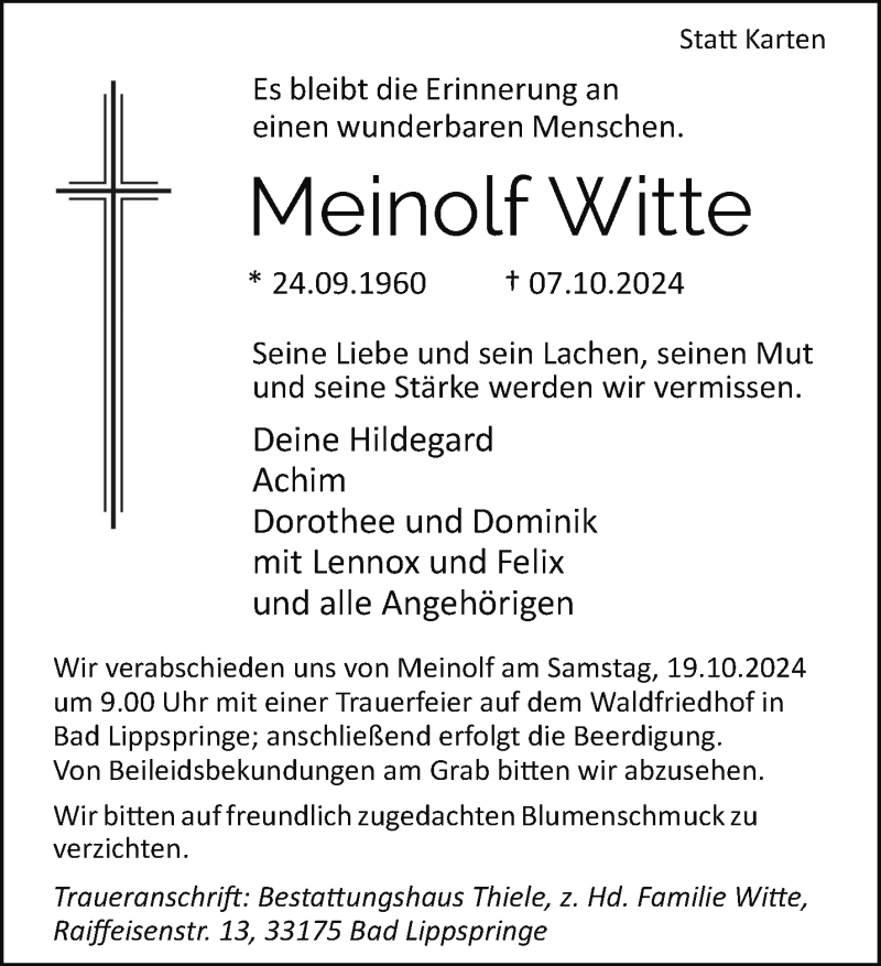 Hier finden Sie alle Traueranzeigen aus der Zeitung, die bisher für Meinolf Witte erschienen sind. Weitere Traueranzeigen, die in der Zeitung erscheinen, werden hier ebenfalls aufgelistet