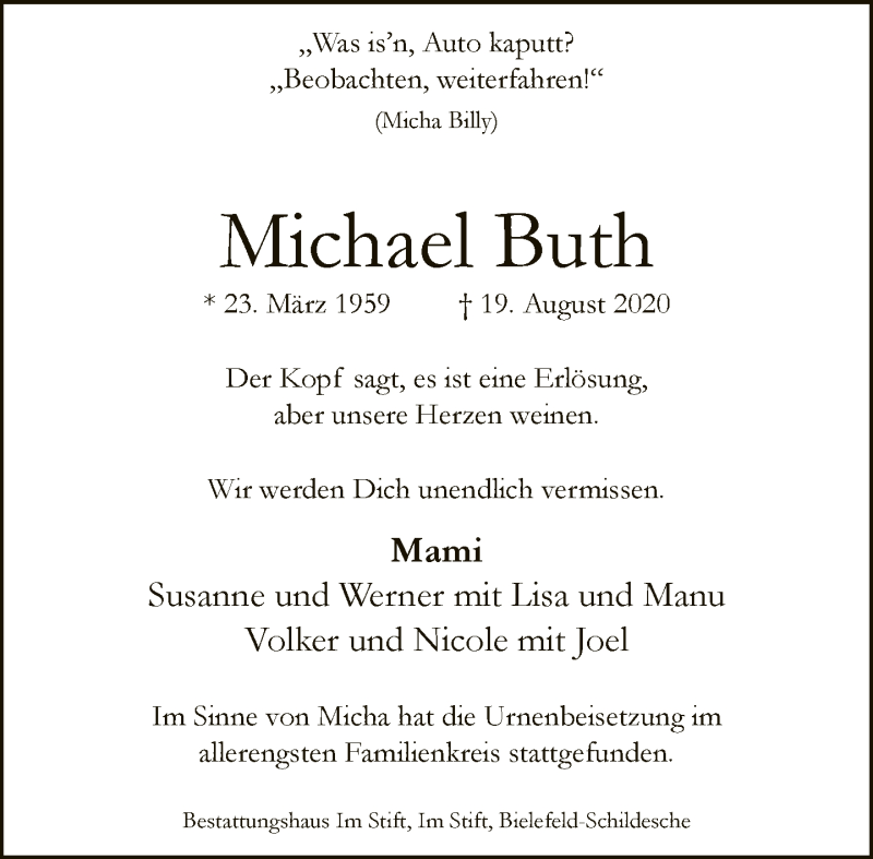 Hier finden Sie alle Traueranzeigen aus der Zeitung, die bisher für Michael Buth erschienen sind. Weitere Traueranzeigen, die in der Zeitung erscheinen, werden hier ebenfalls aufgelistet