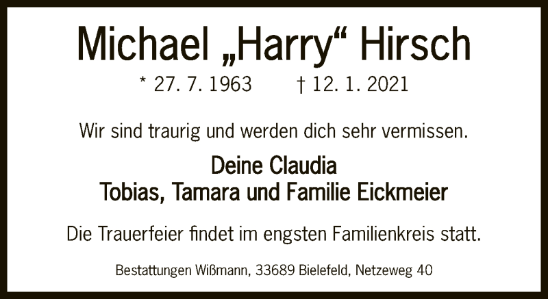 Hier finden Sie alle Traueranzeigen aus der Zeitung, die bisher für Michael Harry Hirsch erschienen sind. Weitere Traueranzeigen, die in der Zeitung erscheinen, werden hier ebenfalls aufgelistet