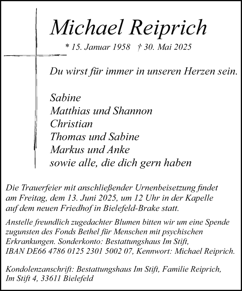 Hier finden Sie alle Traueranzeigen aus der Zeitung, die bisher für Michael Reiprich erschienen sind. Weitere Traueranzeigen, die in der Zeitung erscheinen, werden hier ebenfalls aufgelistet