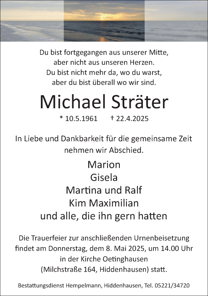 Hier finden Sie alle Traueranzeigen aus der Zeitung, die bisher für Michael Sträter erschienen sind. Weitere Traueranzeigen, die in der Zeitung erscheinen, werden hier ebenfalls aufgelistet