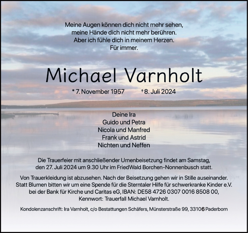 Hier finden Sie alle Traueranzeigen aus der Zeitung, die bisher für Michael Varnholt erschienen sind. Weitere Traueranzeigen, die in der Zeitung erscheinen, werden hier ebenfalls aufgelistet