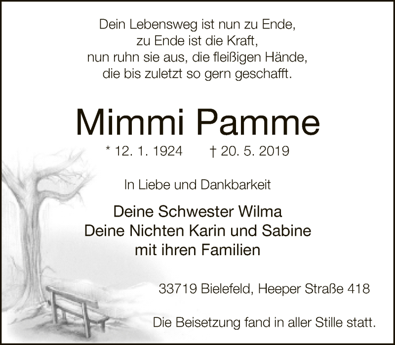 Hier finden Sie alle Traueranzeigen aus der Zeitung, die bisher für Mimmi Pamme erschienen sind. Weitere Traueranzeigen, die in der Zeitung erscheinen, werden hier ebenfalls aufgelistet