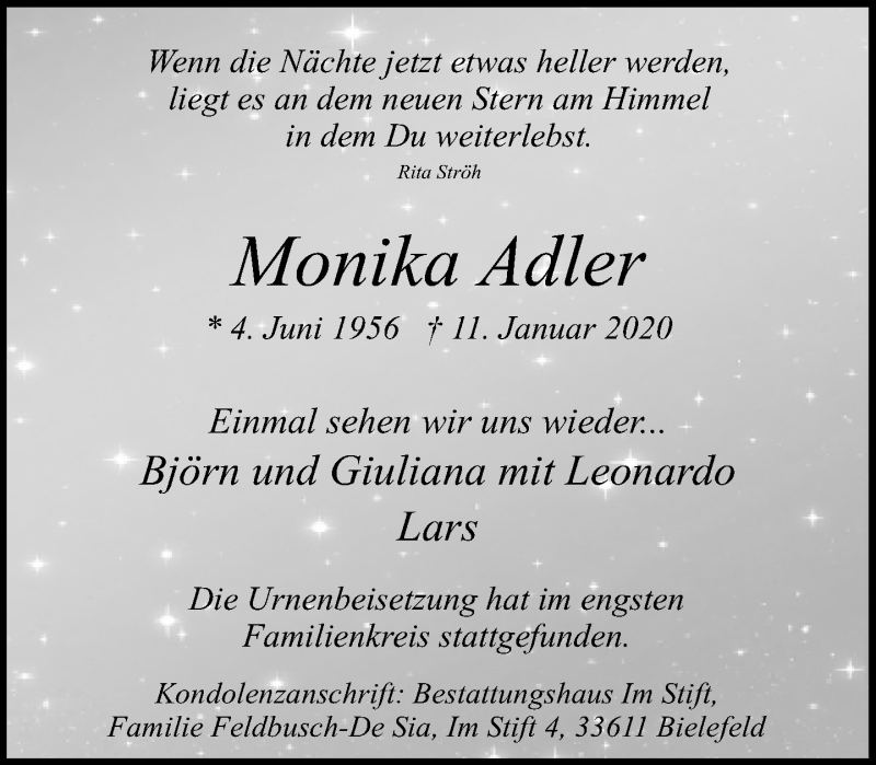 Hier finden Sie alle Traueranzeigen aus der Zeitung, die bisher für Monika Adler erschienen sind. Weitere Traueranzeigen, die in der Zeitung erscheinen, werden hier ebenfalls aufgelistet
