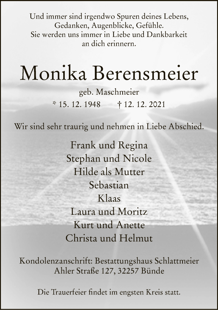 Hier finden Sie alle Traueranzeigen aus der Zeitung, die bisher für Monika Berensmeier erschienen sind. Weitere Traueranzeigen, die in der Zeitung erscheinen, werden hier ebenfalls aufgelistet