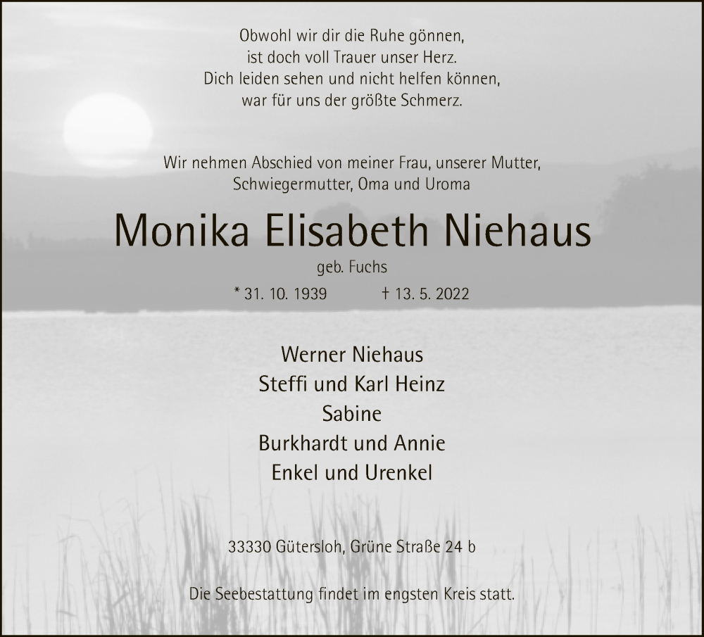 Hier finden Sie alle Traueranzeigen aus der Zeitung, die bisher für Monika Elisabeth Niehaus erschienen sind. Weitere Traueranzeigen, die in der Zeitung erscheinen, werden hier ebenfalls aufgelistet