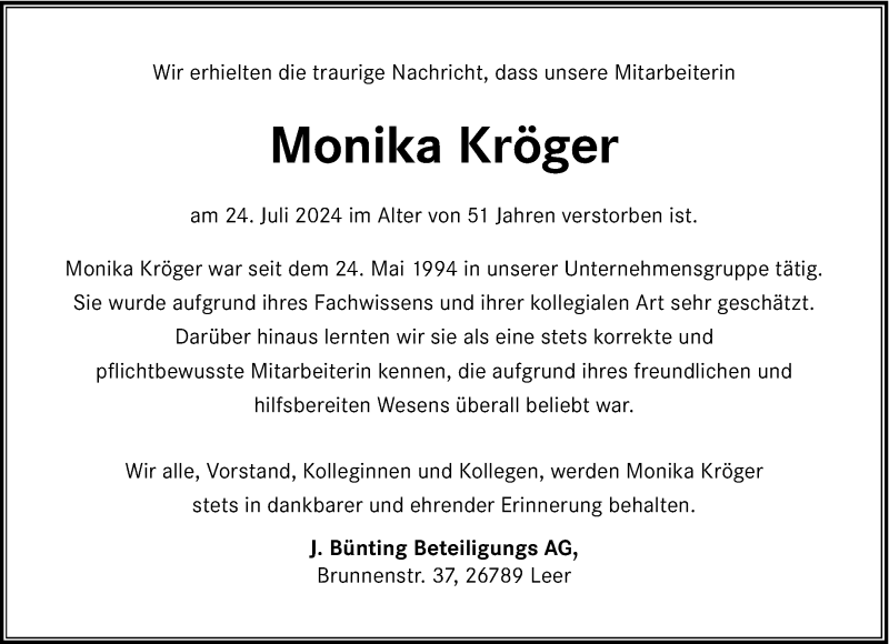 Hier finden Sie alle Traueranzeigen aus der Zeitung, die bisher für Monika Kröger erschienen sind. Weitere Traueranzeigen, die in der Zeitung erscheinen, werden hier ebenfalls aufgelistet