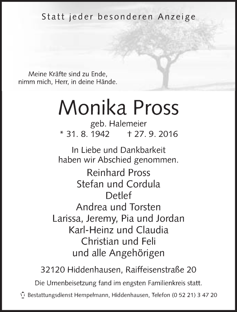 Hier finden Sie alle Traueranzeigen aus der Zeitung, die bisher für Monika Pross erschienen sind. Weitere Traueranzeigen, die in der Zeitung erscheinen, werden hier ebenfalls aufgelistet