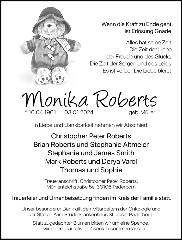 Hier finden Sie alle Traueranzeigen aus der Zeitung, die bisher für Monika Roberts erschienen sind. Weitere Traueranzeigen, die in der Zeitung erscheinen, werden hier ebenfalls aufgelistet