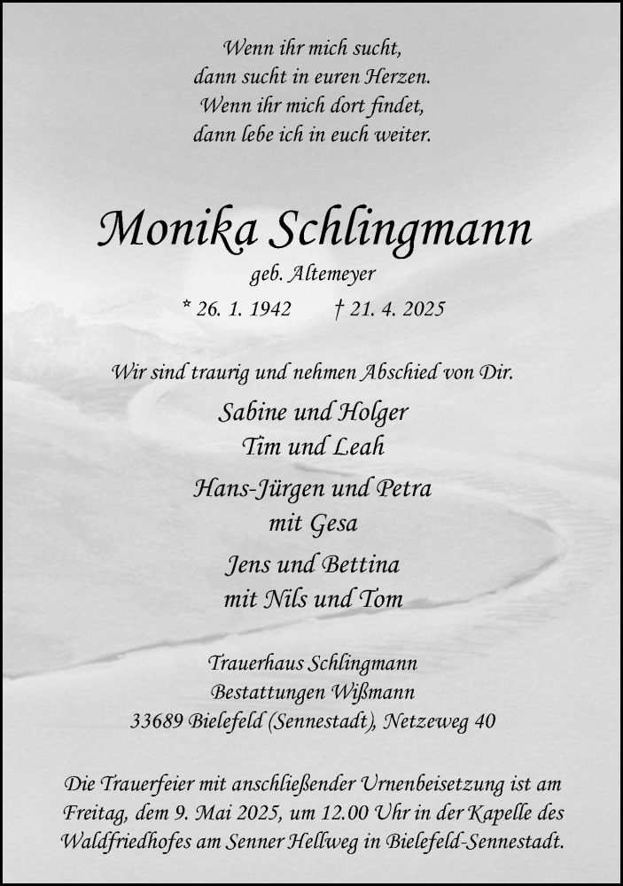 Hier finden Sie alle Traueranzeigen aus der Zeitung, die bisher für Monika Schlingmann erschienen sind. Weitere Traueranzeigen, die in der Zeitung erscheinen, werden hier ebenfalls aufgelistet
