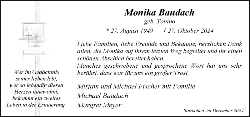 Hier finden Sie alle Traueranzeigen aus der Zeitung, die bisher für Monika Tonino Baudach erschienen sind. Weitere Traueranzeigen, die in der Zeitung erscheinen, werden hier ebenfalls aufgelistet