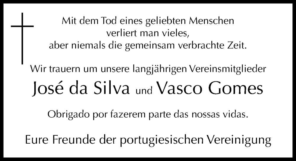 Hier finden Sie alle Traueranzeigen aus der Zeitung, die bisher für Nachruf portugiesische Vereinigung erschienen sind. Weitere Traueranzeigen, die in der Zeitung erscheinen, werden hier ebenfalls aufgelistet