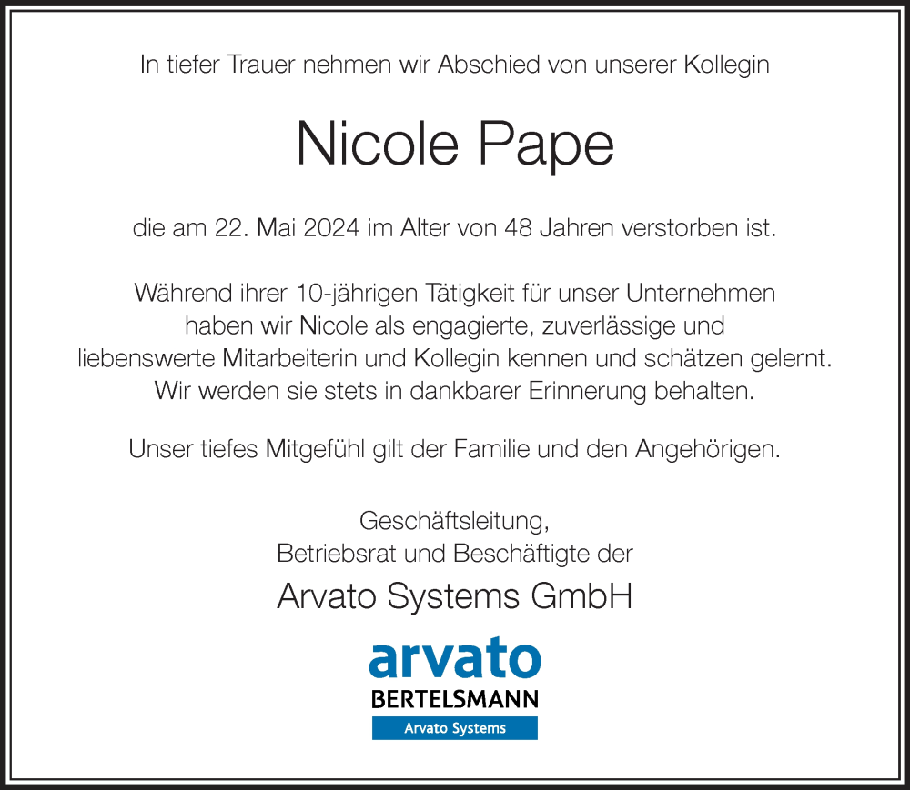 Hier finden Sie alle Traueranzeigen aus der Zeitung, die bisher für Nicole Pape erschienen sind. Weitere Traueranzeigen, die in der Zeitung erscheinen, werden hier ebenfalls aufgelistet