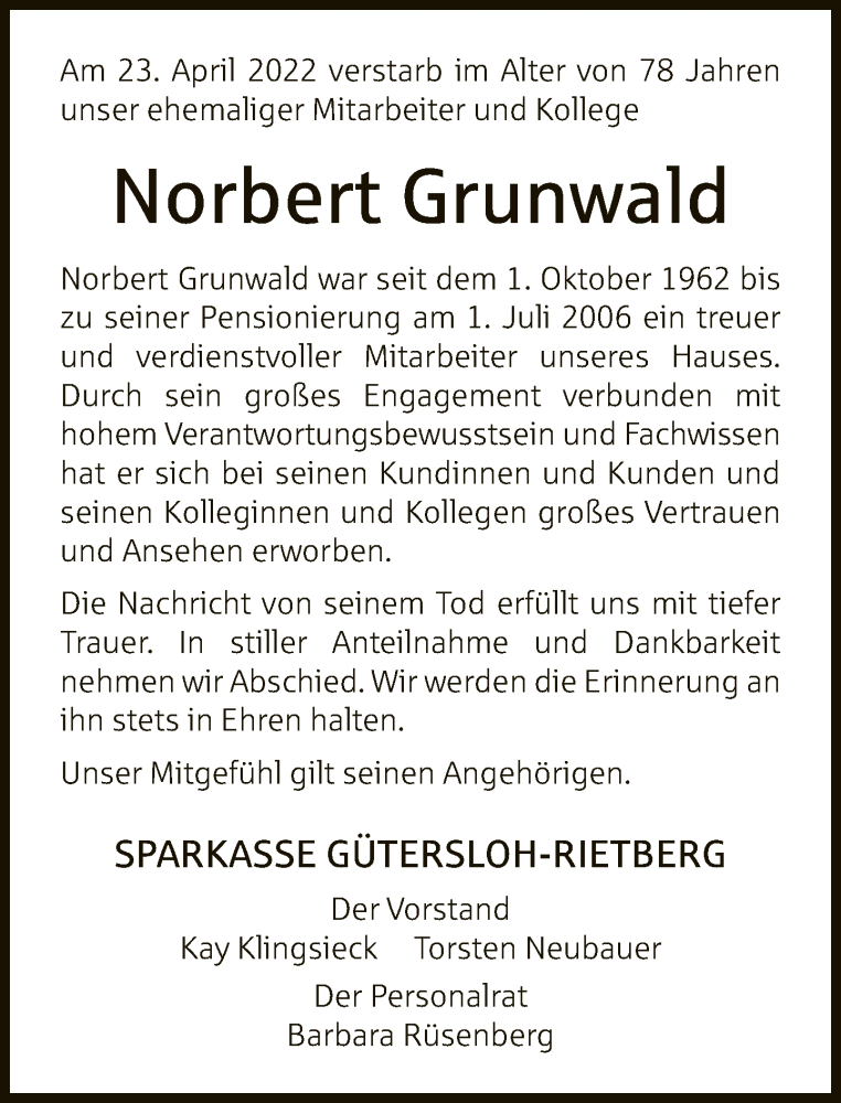 Hier finden Sie alle Traueranzeigen aus der Zeitung, die bisher für Norbert Grunwald erschienen sind. Weitere Traueranzeigen, die in der Zeitung erscheinen, werden hier ebenfalls aufgelistet