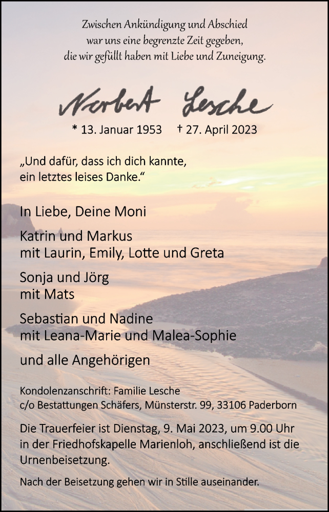 Hier finden Sie alle Traueranzeigen aus der Zeitung, die bisher für Norbert Lesche erschienen sind. Weitere Traueranzeigen, die in der Zeitung erscheinen, werden hier ebenfalls aufgelistet