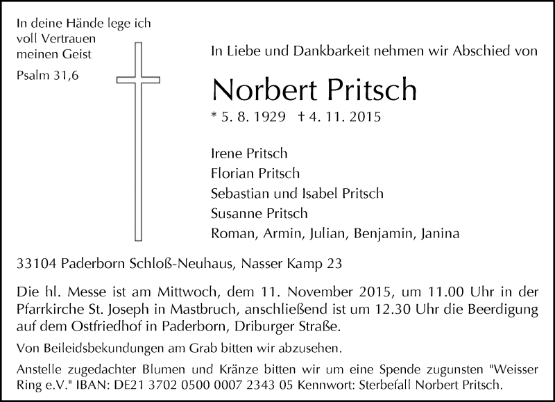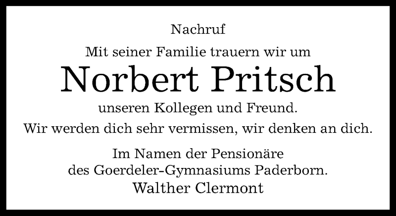 Hier finden Sie alle Traueranzeigen aus der Zeitung, die bisher für Norbert Pritsch erschienen sind. Weitere Traueranzeigen, die in der Zeitung erscheinen, werden hier ebenfalls aufgelistet