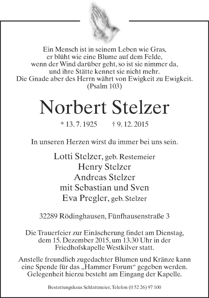Hier finden Sie alle Traueranzeigen aus der Zeitung, die bisher für Norbert Stelzer erschienen sind. Weitere Traueranzeigen, die in der Zeitung erscheinen, werden hier ebenfalls aufgelistet