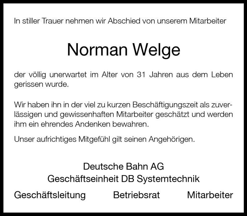 Hier finden Sie alle Traueranzeigen aus der Zeitung, die bisher für Norman Welge erschienen sind. Weitere Traueranzeigen, die in der Zeitung erscheinen, werden hier ebenfalls aufgelistet