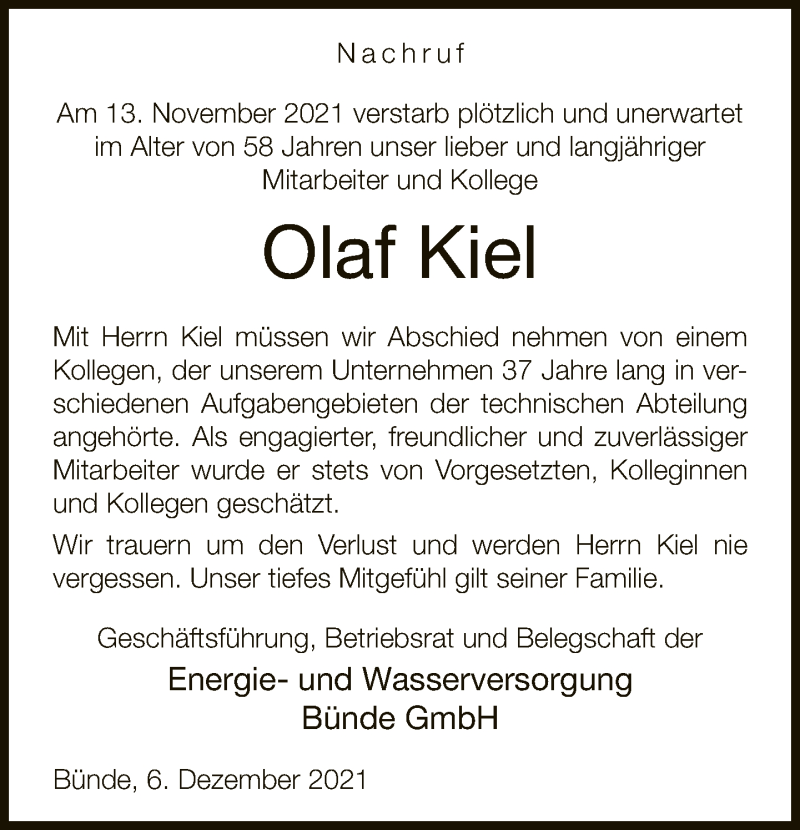 Hier finden Sie alle Traueranzeigen aus der Zeitung, die bisher für Olaf Kiel erschienen sind. Weitere Traueranzeigen, die in der Zeitung erscheinen, werden hier ebenfalls aufgelistet