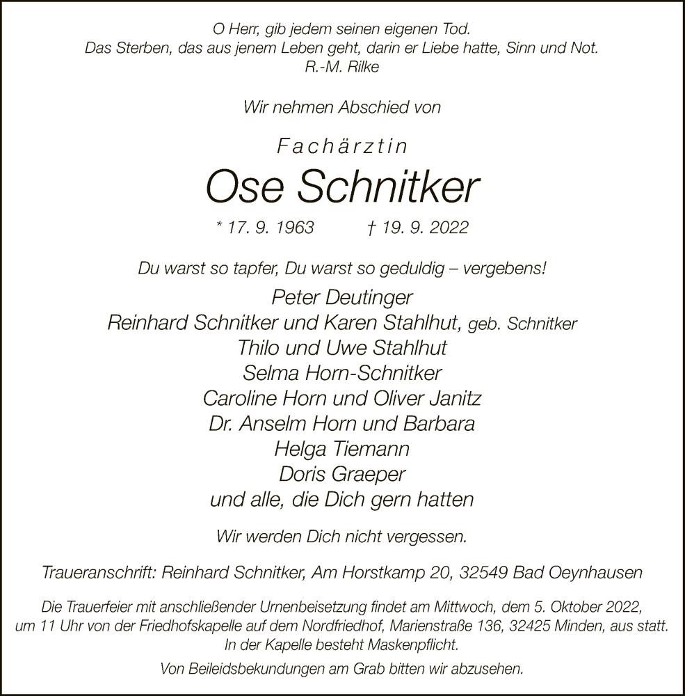 Hier finden Sie alle Traueranzeigen aus der Zeitung, die bisher für Ose Schnitker erschienen sind. Weitere Traueranzeigen, die in der Zeitung erscheinen, werden hier ebenfalls aufgelistet