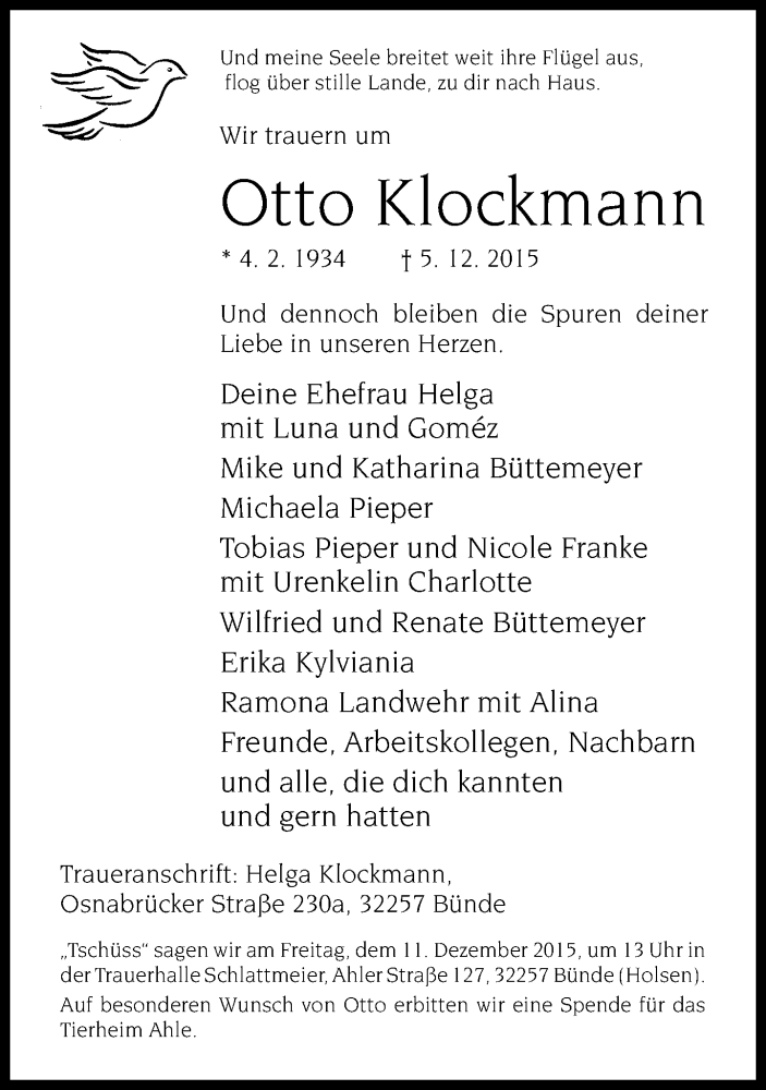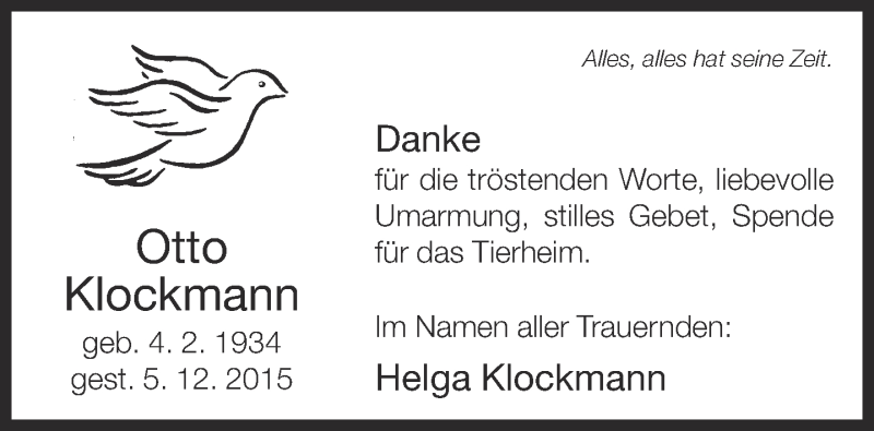 Hier finden Sie alle Traueranzeigen aus der Zeitung, die bisher für Otto Klockmann erschienen sind. Weitere Traueranzeigen, die in der Zeitung erscheinen, werden hier ebenfalls aufgelistet