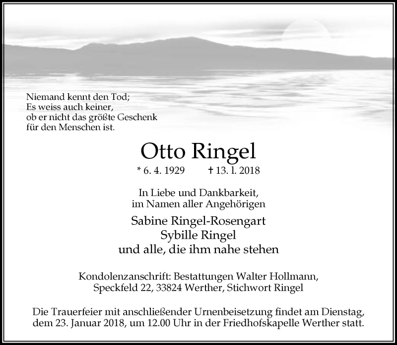 Hier finden Sie alle Traueranzeigen aus der Zeitung, die bisher für Otto Ringel erschienen sind. Weitere Traueranzeigen, die in der Zeitung erscheinen, werden hier ebenfalls aufgelistet