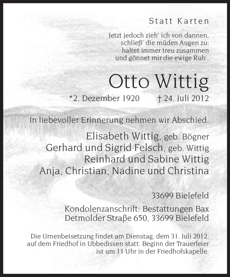 Hier finden Sie alle Traueranzeigen aus der Zeitung, die bisher für Otto Wittig erschienen sind. Weitere Traueranzeigen, die in der Zeitung erscheinen, werden hier ebenfalls aufgelistet