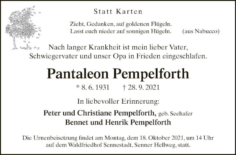 Hier finden Sie alle Traueranzeigen aus der Zeitung, die bisher für Pantaleon Pempelforth erschienen sind. Weitere Traueranzeigen, die in der Zeitung erscheinen, werden hier ebenfalls aufgelistet