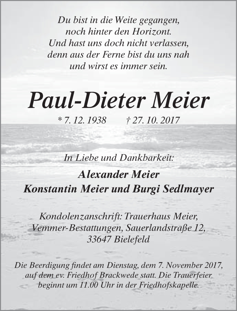 Hier finden Sie alle Traueranzeigen aus der Zeitung, die bisher für Paul-Dieter Meier erschienen sind. Weitere Traueranzeigen, die in der Zeitung erscheinen, werden hier ebenfalls aufgelistet