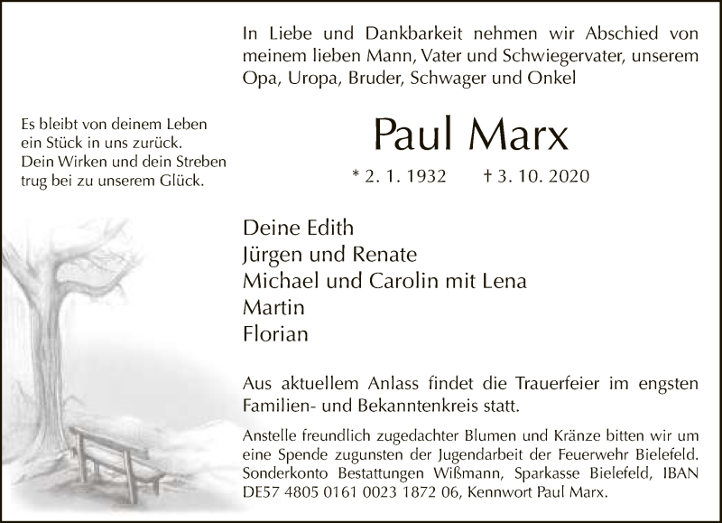 Hier finden Sie alle Traueranzeigen aus der Zeitung, die bisher für Paul Marx erschienen sind. Weitere Traueranzeigen, die in der Zeitung erscheinen, werden hier ebenfalls aufgelistet