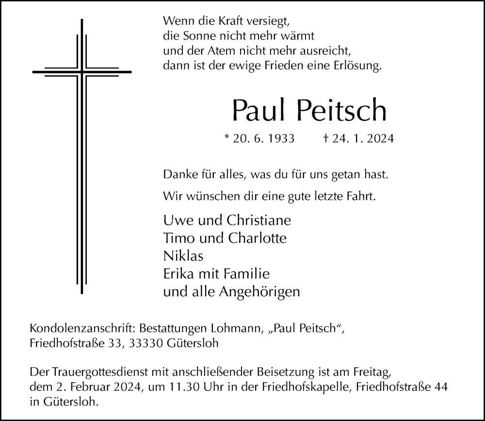 Hier finden Sie alle Traueranzeigen aus der Zeitung, die bisher für Paul Peitsch erschienen sind. Weitere Traueranzeigen, die in der Zeitung erscheinen, werden hier ebenfalls aufgelistet