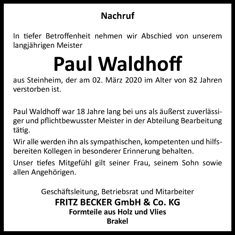 Hier finden Sie alle Traueranzeigen aus der Zeitung, die bisher für Paul Waldhoff erschienen sind. Weitere Traueranzeigen, die in der Zeitung erscheinen, werden hier ebenfalls aufgelistet