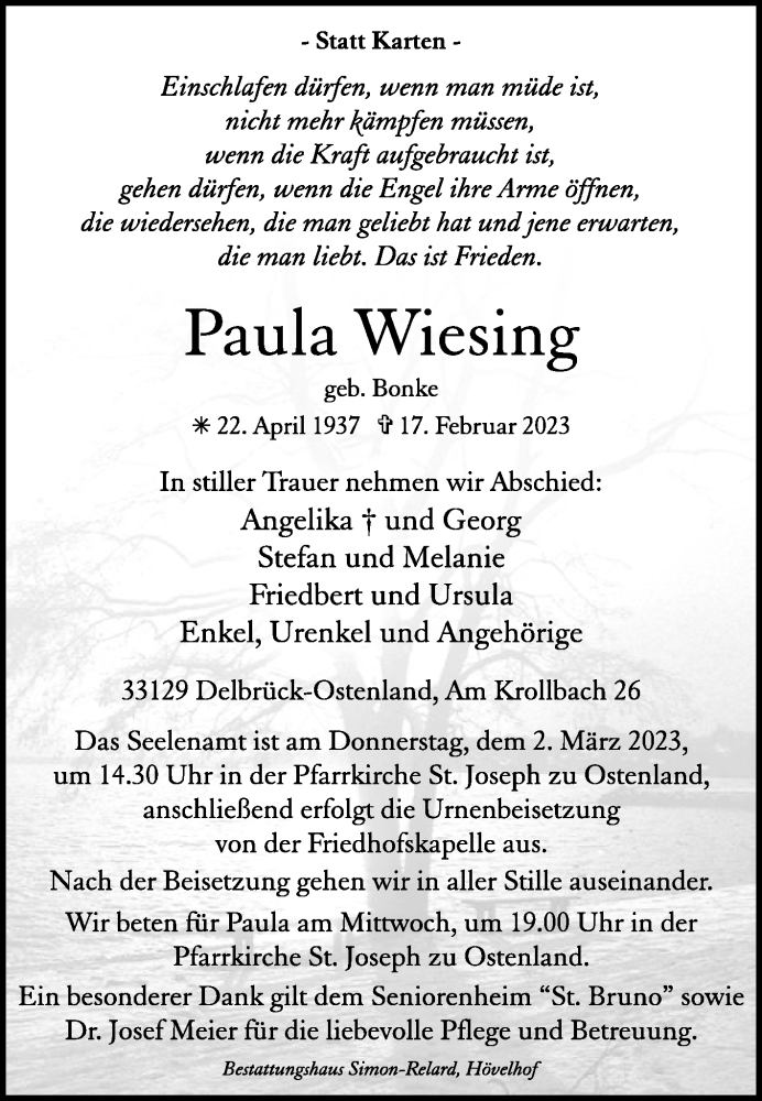 Hier finden Sie alle Traueranzeigen aus der Zeitung, die bisher für Paula Wiesing erschienen sind. Weitere Traueranzeigen, die in der Zeitung erscheinen, werden hier ebenfalls aufgelistet