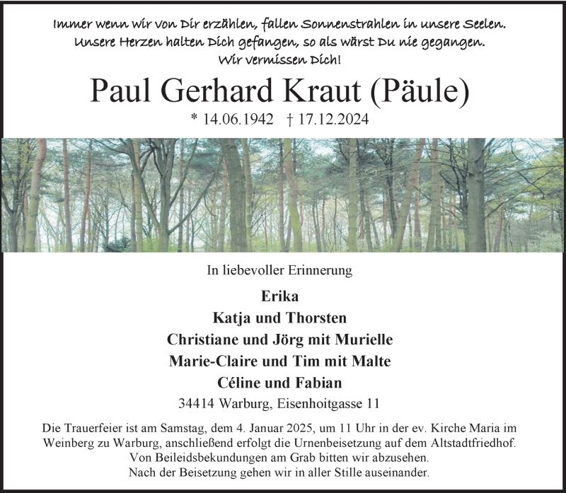 Hier finden Sie alle Traueranzeigen aus der Zeitung, die bisher für Paul Gerhard Kraut erschienen sind. Weitere Traueranzeigen, die in der Zeitung erscheinen, werden hier ebenfalls aufgelistet