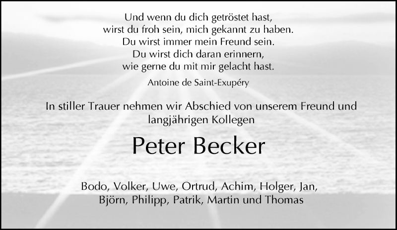 Hier finden Sie alle Traueranzeigen aus der Zeitung, die bisher für Peter Becker erschienen sind. Weitere Traueranzeigen, die in der Zeitung erscheinen, werden hier ebenfalls aufgelistet