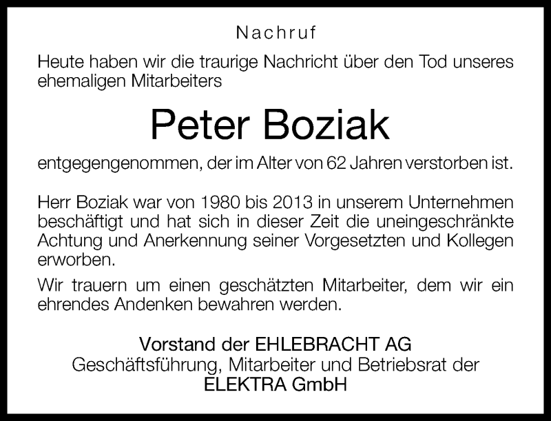 Hier finden Sie alle Traueranzeigen aus der Zeitung, die bisher für Peter Boziak erschienen sind. Weitere Traueranzeigen, die in der Zeitung erscheinen, werden hier ebenfalls aufgelistet