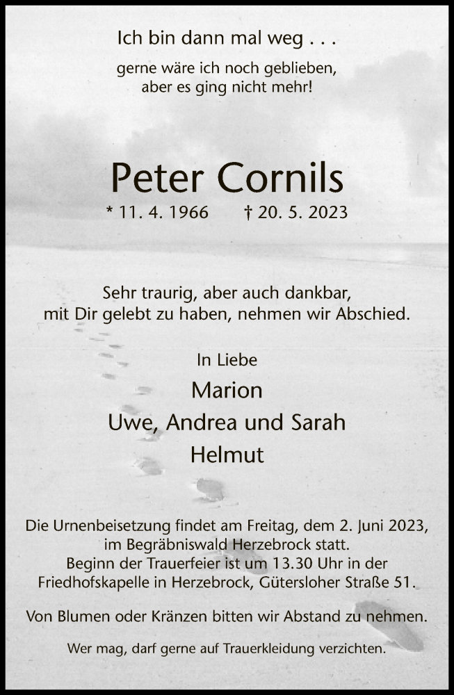 Hier finden Sie alle Traueranzeigen aus der Zeitung, die bisher für Peter Cornils erschienen sind. Weitere Traueranzeigen, die in der Zeitung erscheinen, werden hier ebenfalls aufgelistet
