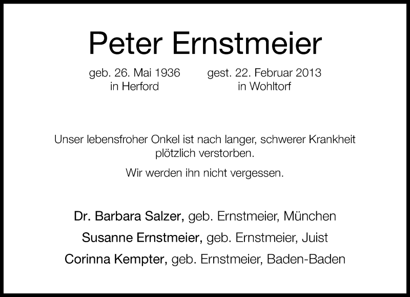 Hier finden Sie alle Traueranzeigen aus der Zeitung, die bisher für Peter Ernstmeier erschienen sind. Weitere Traueranzeigen, die in der Zeitung erscheinen, werden hier ebenfalls aufgelistet
