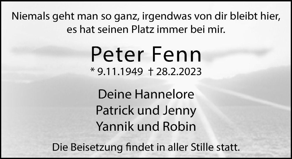 Hier finden Sie alle Traueranzeigen aus der Zeitung, die bisher für Peter Fenn erschienen sind. Weitere Traueranzeigen, die in der Zeitung erscheinen, werden hier ebenfalls aufgelistet
