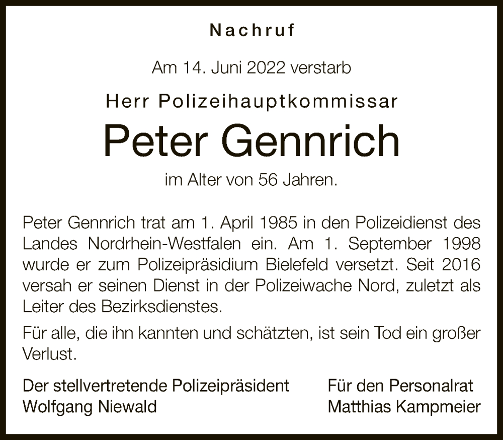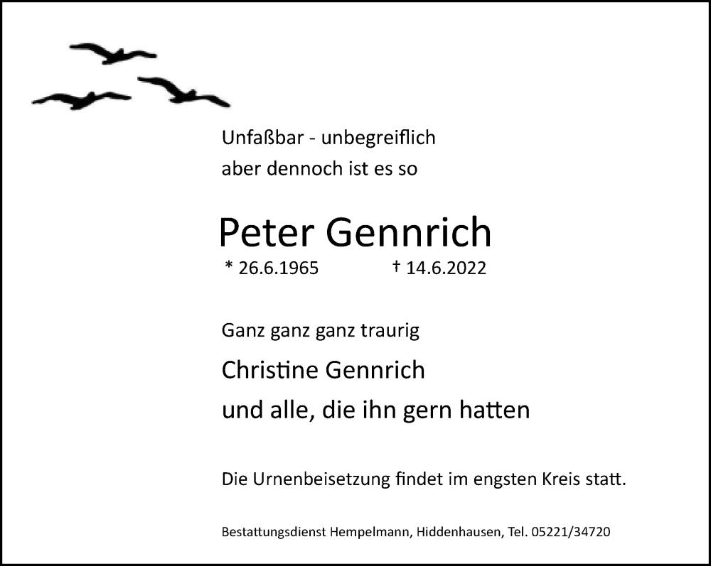 Hier finden Sie alle Traueranzeigen aus der Zeitung, die bisher für Peter Gennrich erschienen sind. Weitere Traueranzeigen, die in der Zeitung erscheinen, werden hier ebenfalls aufgelistet