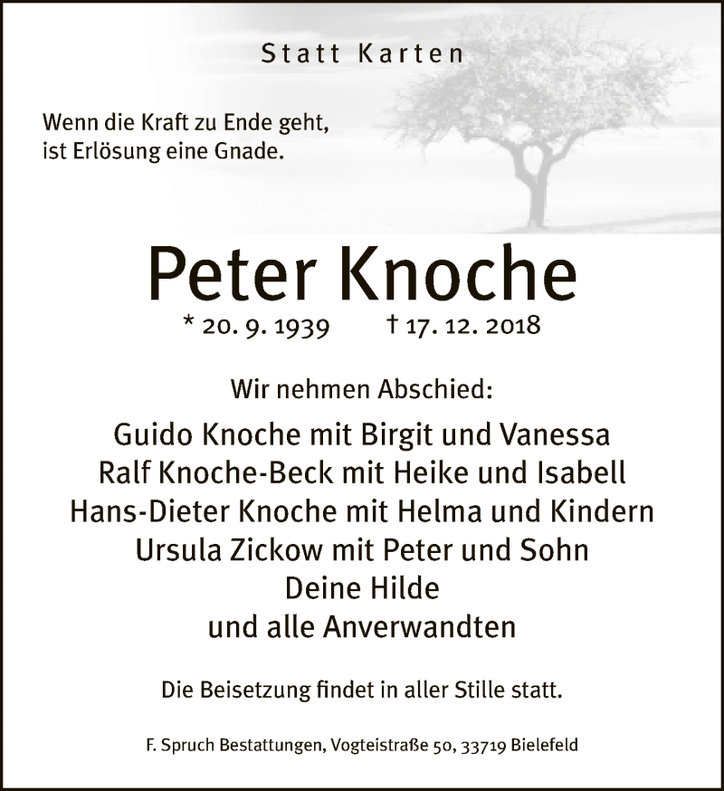 Hier finden Sie alle Traueranzeigen aus der Zeitung, die bisher für Peter Knoche erschienen sind. Weitere Traueranzeigen, die in der Zeitung erscheinen, werden hier ebenfalls aufgelistet